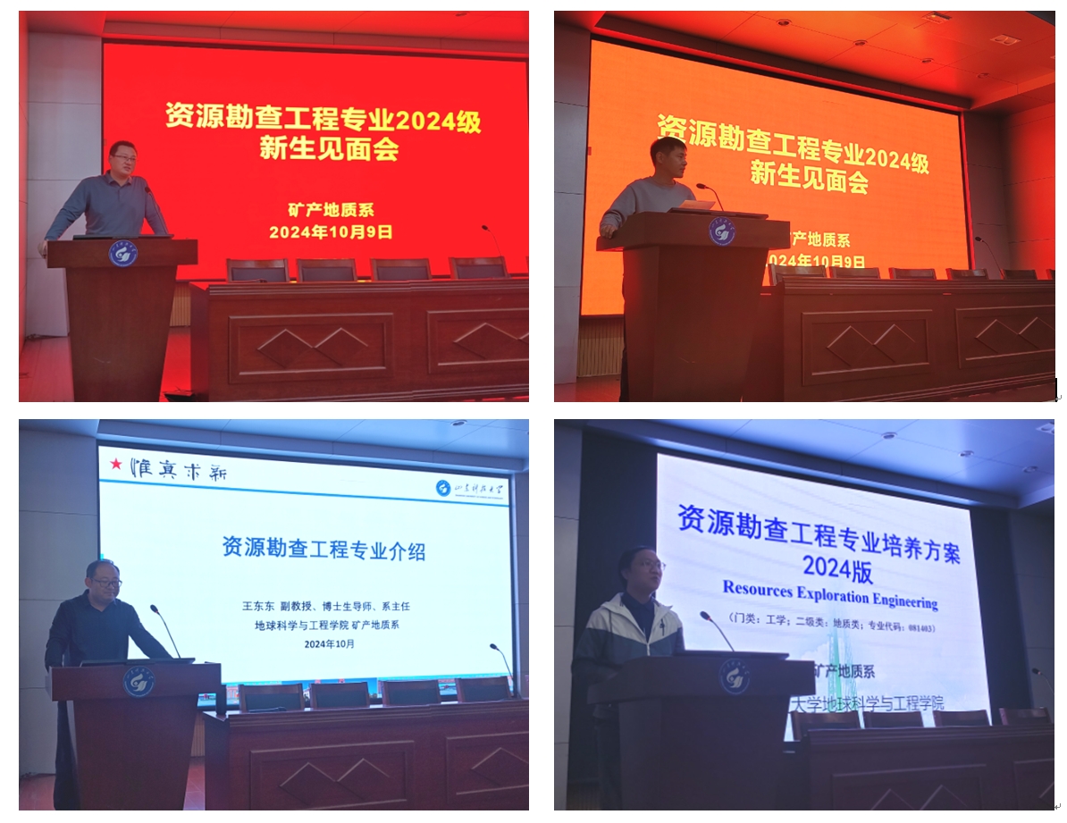 矿产地质系主任王东东从资源勘查工程专业的内涵、发展沿革、学科与平台、团队、实习实训、交流与创新,专业育人理念、环节机制、育人效果,专业服务领域与毕业生去向等方面向2024级新生进行了较为全面的介绍。张晓阳副主任对2024版资源勘查工程专业培养方案的修订、培养目标、毕业要求、课程体系设置等方面进行了详细的解读。