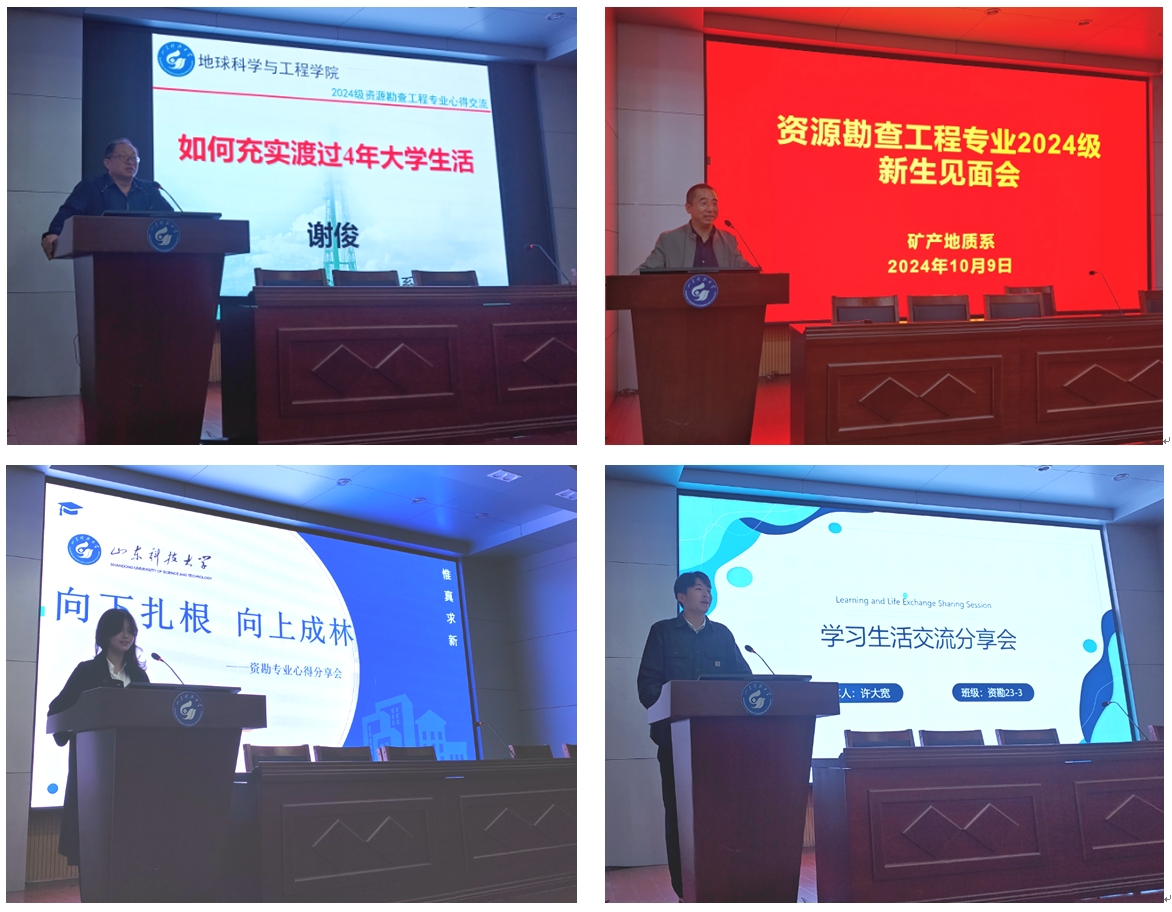 教师代表谢俊教授和毛光周教授,分享了自己多年的教学与育人经验与心得体会,并针对如何过好老员工活、做一名优秀的老员工,向2024级新生提出了诸多良好的建议。资源勘查工程专业在校生代表2021-1邓家榕、2022-2刘清坤、2023-2陈思予婷、2023-3许大宽四位同学结合自己的大学学习与生活经历,从课程学习、实习实践、竞赛活动、创新创业、社团活动、校园生活、考研与就业等多个方面分享了自己的体会、经验与得失。