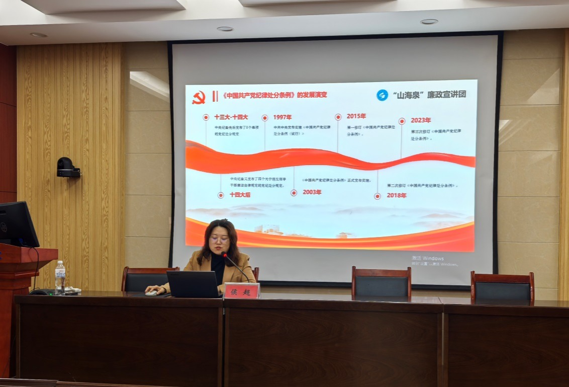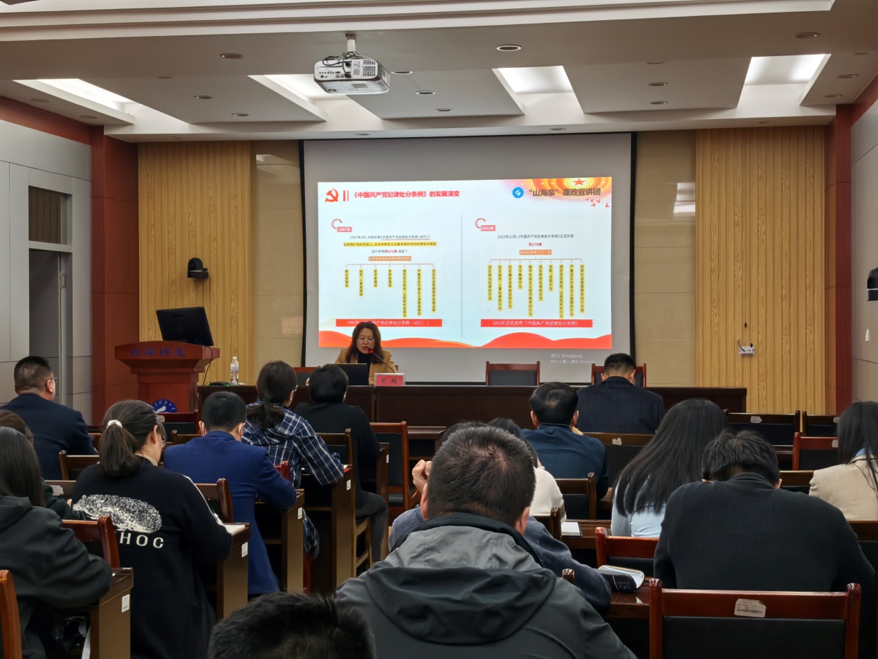 为深入学习新修订的《中国共产党纪律处分条例》,抓实党纪学习教育,4月23日,公司党委理论学习中心组(扩大)进行第四次集体学习,本次学习邀请公司“山海泉”廉政宣讲团成员、公司党委巡察办公室侯超老师做党纪专题报告。公司党委理论学习中心组成员、各支部委员、各科室管理干部和辅导员参加报告会,报告由公司党委委员、副经理杨仁超主持。