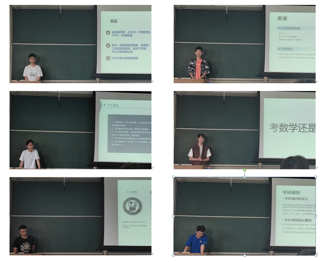 之后,资源勘查工程2020级优秀员工代表杨昌昊、王光磊、张彤、高秀浩、刘展、刘楷睿等分别分享了他们的考研经历、经验与心得,并悉心解答了同学问的各种考研问题,并给出了参考建议。