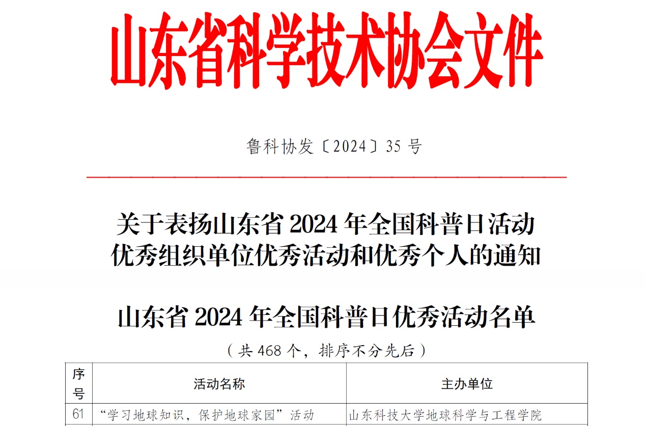 近日,山东省科学技术协会发布了《关于表扬山东省2024年全国科普日活动优秀组织单位优秀活动和优秀个人的通知》,bevictor1946韦德官网地球科学馆主办的“学习地球知识,保护地球家园”科普基地游活动获评“山东省2024年全国科普日优秀活动”。