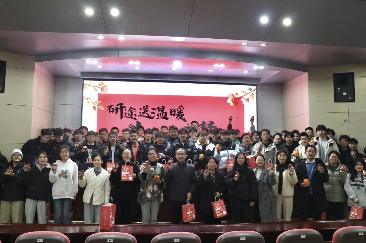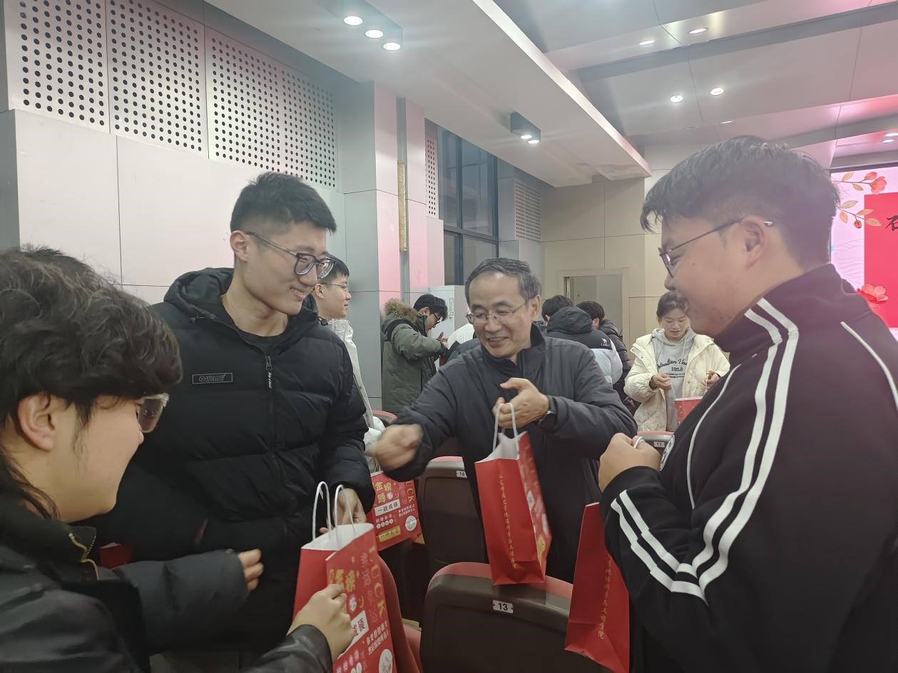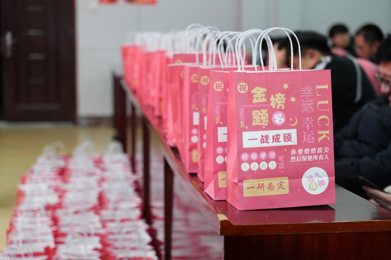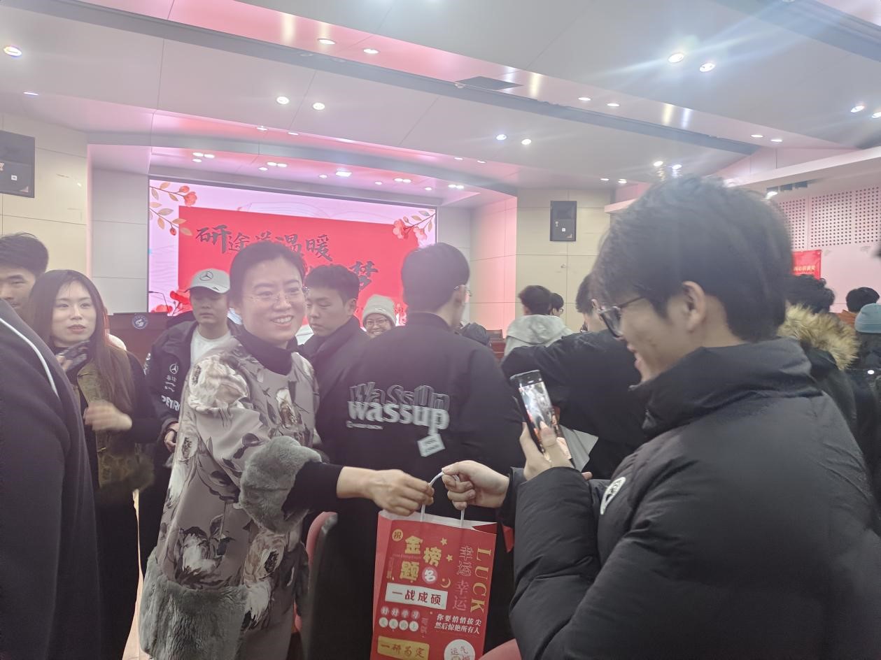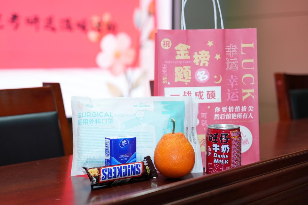 随后,老师们为考研学子送上了公司精心准备的“金榜题名”考研暖心礼包。每份礼包内含寓意“强盾护体”的口罩纸巾、“旺气冲天”的旺仔牛奶、“活力满满”的士力架以及象征“一战‘橙’功”的甜橙。小小礼包,承载着公司的深切关怀;甜甜橙子,寄托着美好的真挚祝愿,让同学们在寒冬备考路上倍感温暖、倍添动力。收到礼物的同学们脸上绽放笑容,纷纷表达对公司暖心支持的感谢,并齐声喊出“金榜题名,一战成‘硕’”的响亮口号,坚定有力的声音回荡在整个报告厅。