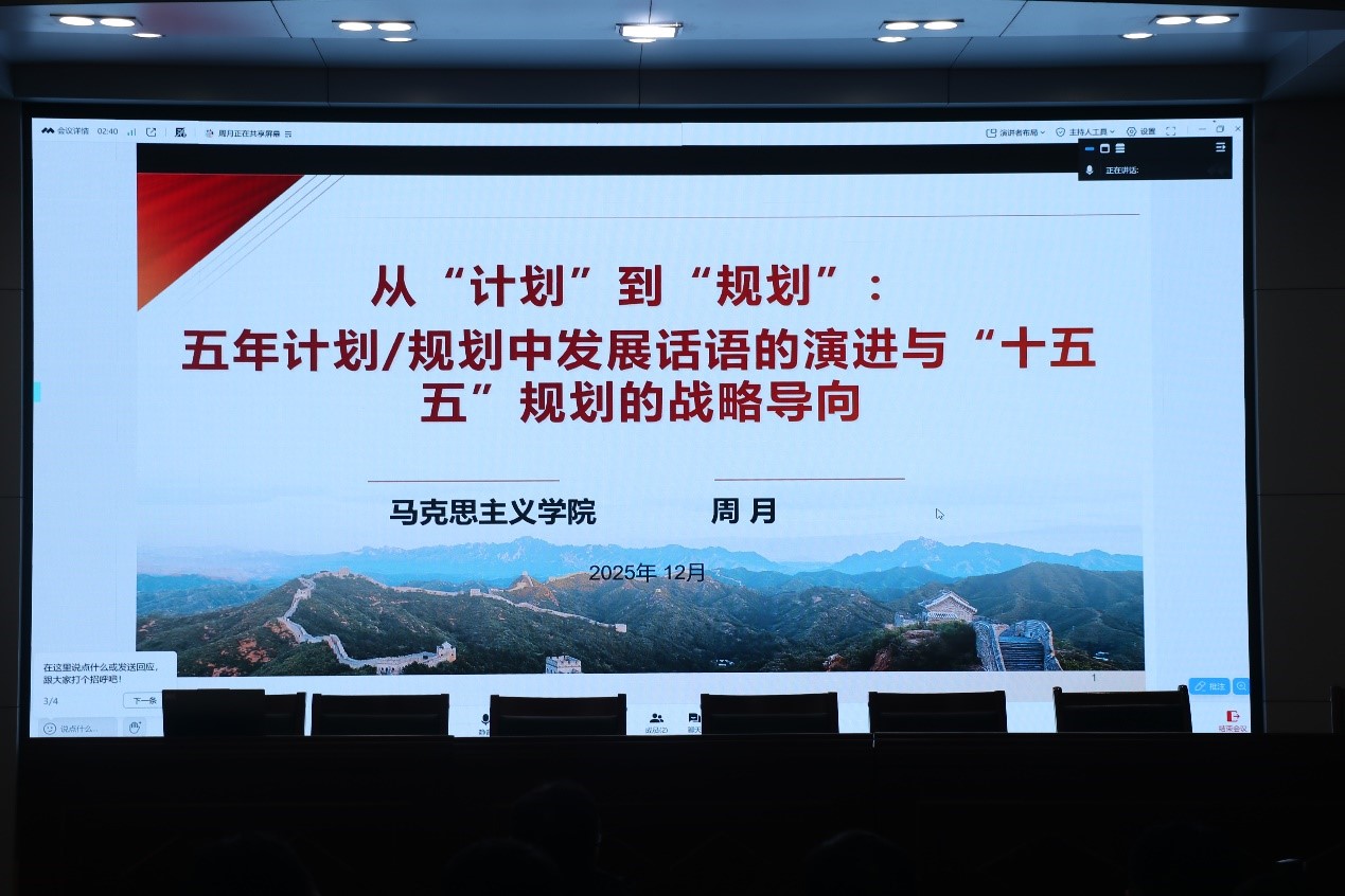 周月以《从“计划”到“规划”——五年计划/规划中发展话语的演进与‘十五五’规划的战略导向》为题,从“ ‘一五’计划到‘十五五’规划中发展话语的演进”、“‘计划’到‘规划’:一词之变背后的治理理念深刻革命”、“‘十五五’规划的战略导向”等三个方面,对国家的十四个五年计划/规划进行了全面梳理,并对党的二十届四中全会做出的“十五五”规划做了系统而深入的阐释。她讲到,“十五五”规划所擘画的宏伟蓝图,无论是高质量发展对发展方式和动力的重塑,还是人与自然和谐共生对现代化路径的界定,为各学科领域提出了全新的时代课题,为以中国式现代化推进强国建设、民族复兴伟业提供了关键支撑。