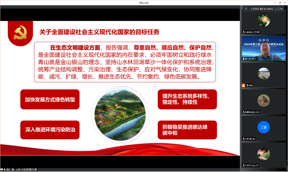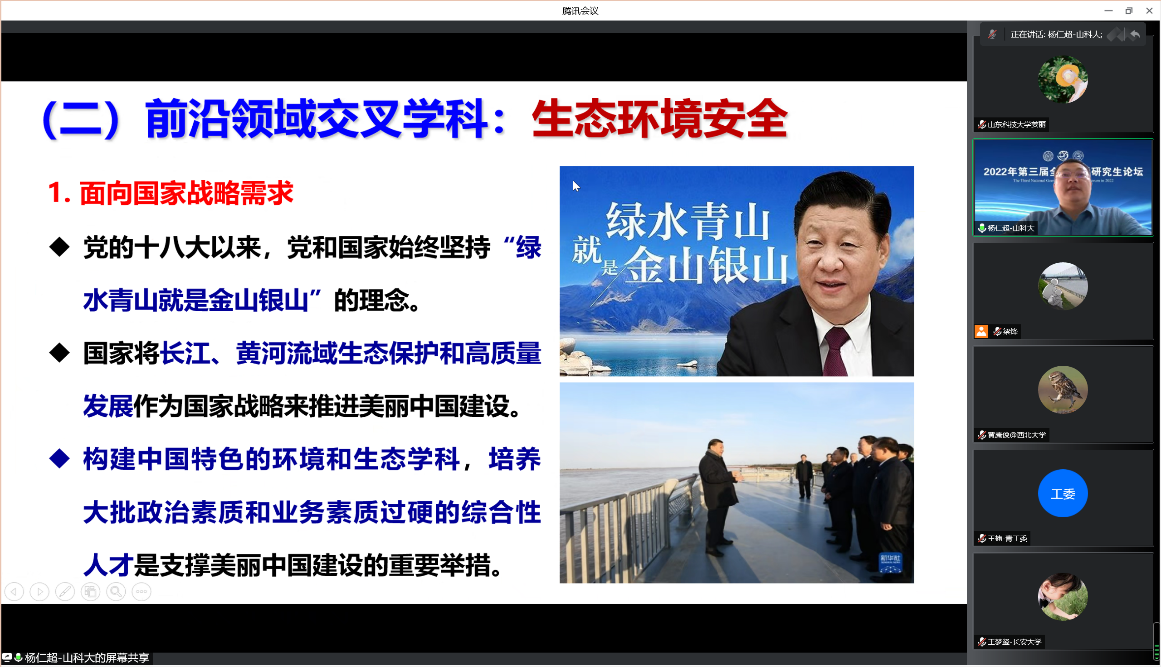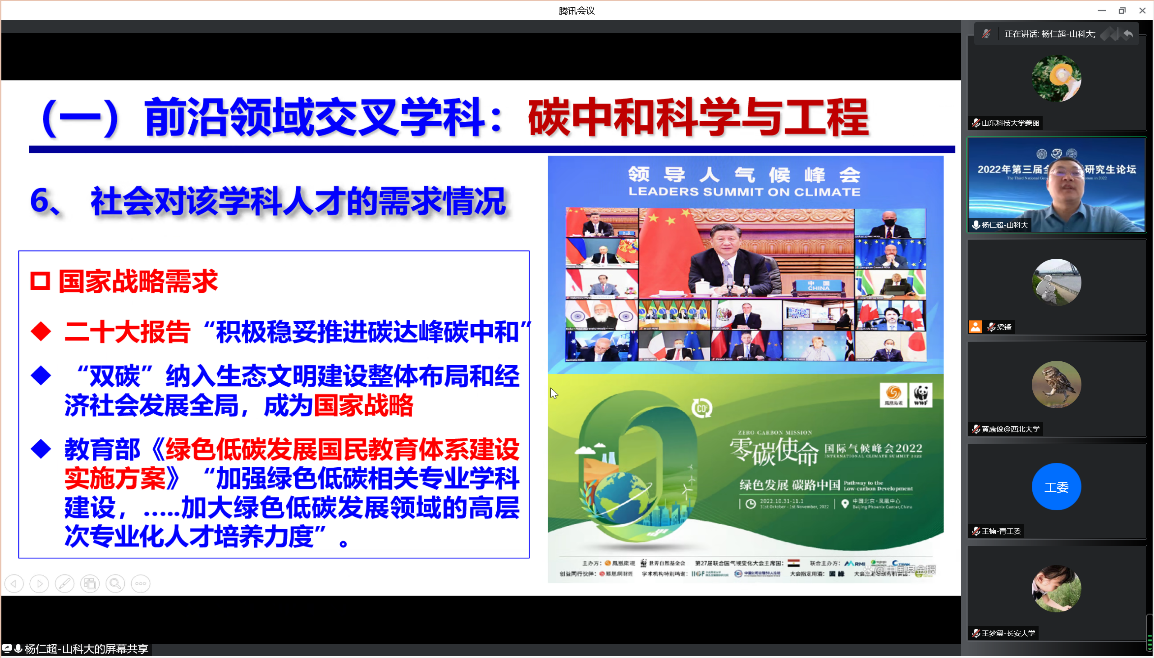 杨仁超教授以党的二十大精神为引领,分别从“面向国家重大战略需求”、“关注前沿领域交叉学科”、“志存高远——寄语青年学子”等三个方面重点阐述了公司在国家“双碳”战略背景下,紧紧围绕党的二十大报告对生态文明建设的战略部署,立足学科深度交叉融合,孕育新的学科生长点,设立“碳中和科学与工程”、“生态环境安全”前沿交叉学科,为国家重大战略提供重要科学支撑,为青年学子的成长成才指明方向。报告最后,杨仁超勉励地学青年学子要仰望苍穹、放眼世界、志存高远,提高服务国家重大战略的自觉性,增强践行国家重大战略的使命感,坚定科技报国的理想信念,为国家的零碳未来作出新的贡献。