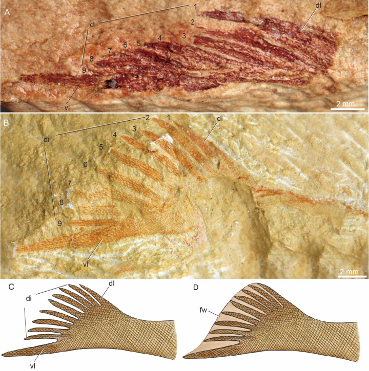 盖志琨介绍,这一新属种的尾鳍具有9个手指状分叉,将其命名为“九尾狐甲鱼”。我国最早发现盔甲鱼类化石可以追溯到1913年。然而,由于盔甲鱼类的身体主要由软骨和零散鳞片组成,很难完整保存为化石,因此,其头后身体解剖难题在过去100多年里都没有解决。2022年,“重庆特异埋藏化石库”中发现的灵动土家鱼首次揭示了盔甲鱼类身体的全貌,但仍缺失尾鳍细节。此次发现的九尾狐甲鱼,补上了最后一块拼图,揭开了盔甲鱼类尾巴的神秘面纱。