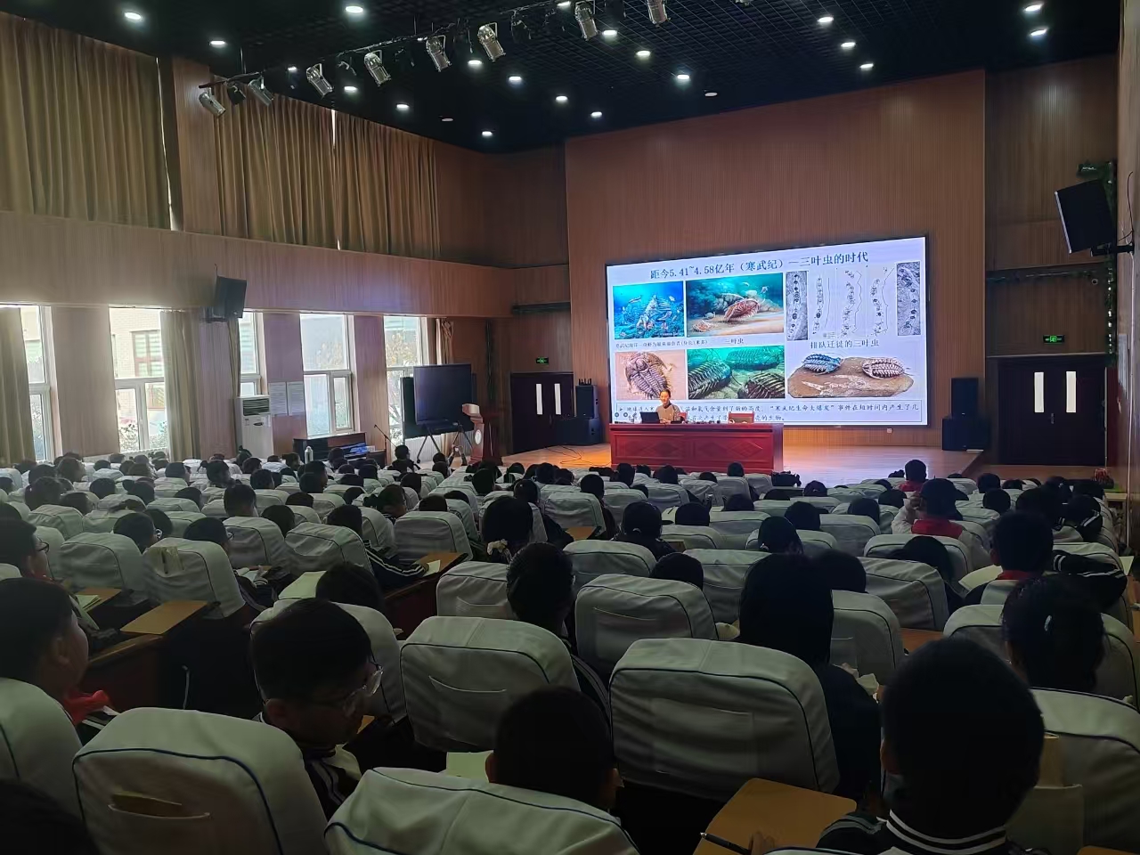 王倩以《地球“时光机”》为题,首先为育英小学师生带来了一场地球科学知识科普讲座。王倩以小员工熟悉的微信开启页面开篇,沿地质时间轴线,用岩石、化石等标本讲述了地球46亿年的地质和生命演化,和同学们一起乘坐“时光机”,踏上了一场别具一格的时空穿越之旅。课堂上,同学们紧跟王老师的思路,积极提问,与老师热烈探讨,氛围活跃而有趣。
